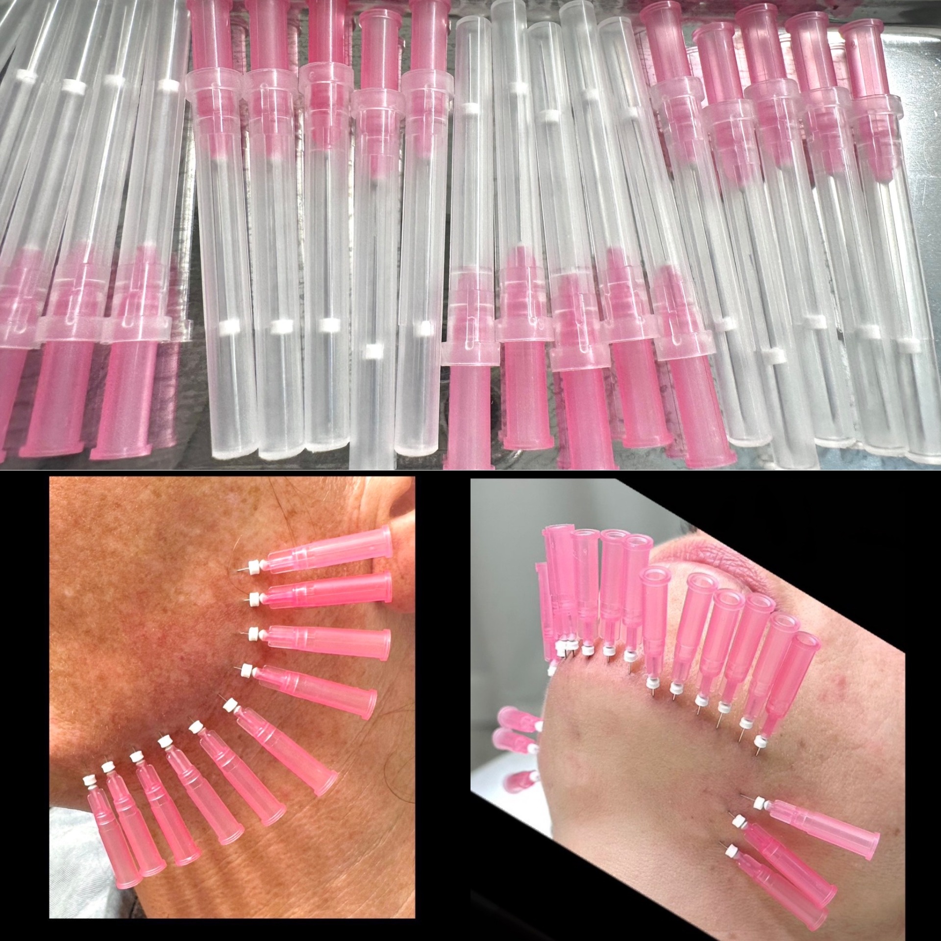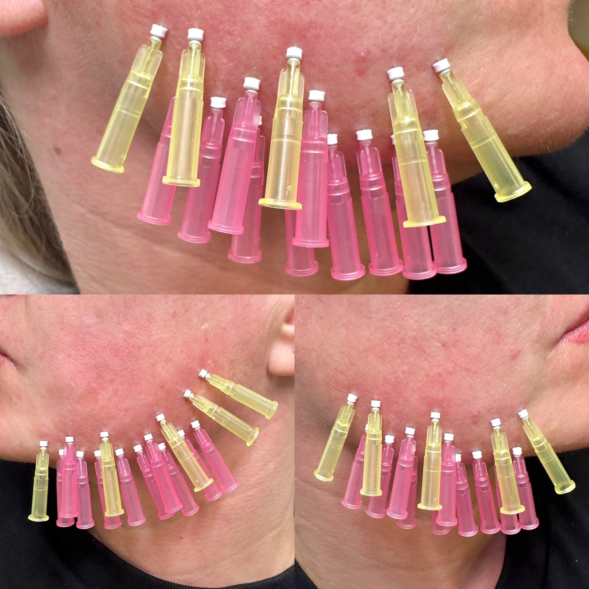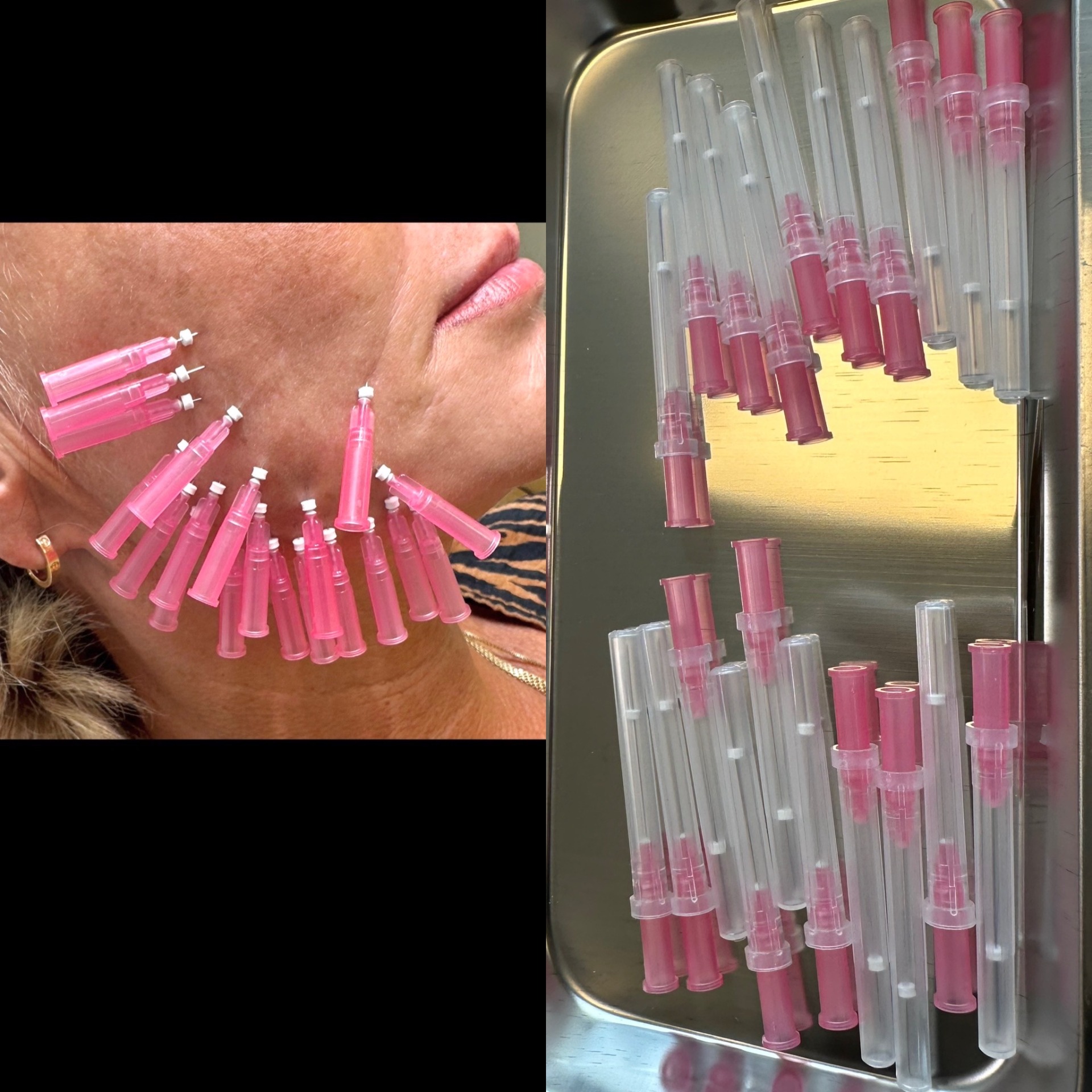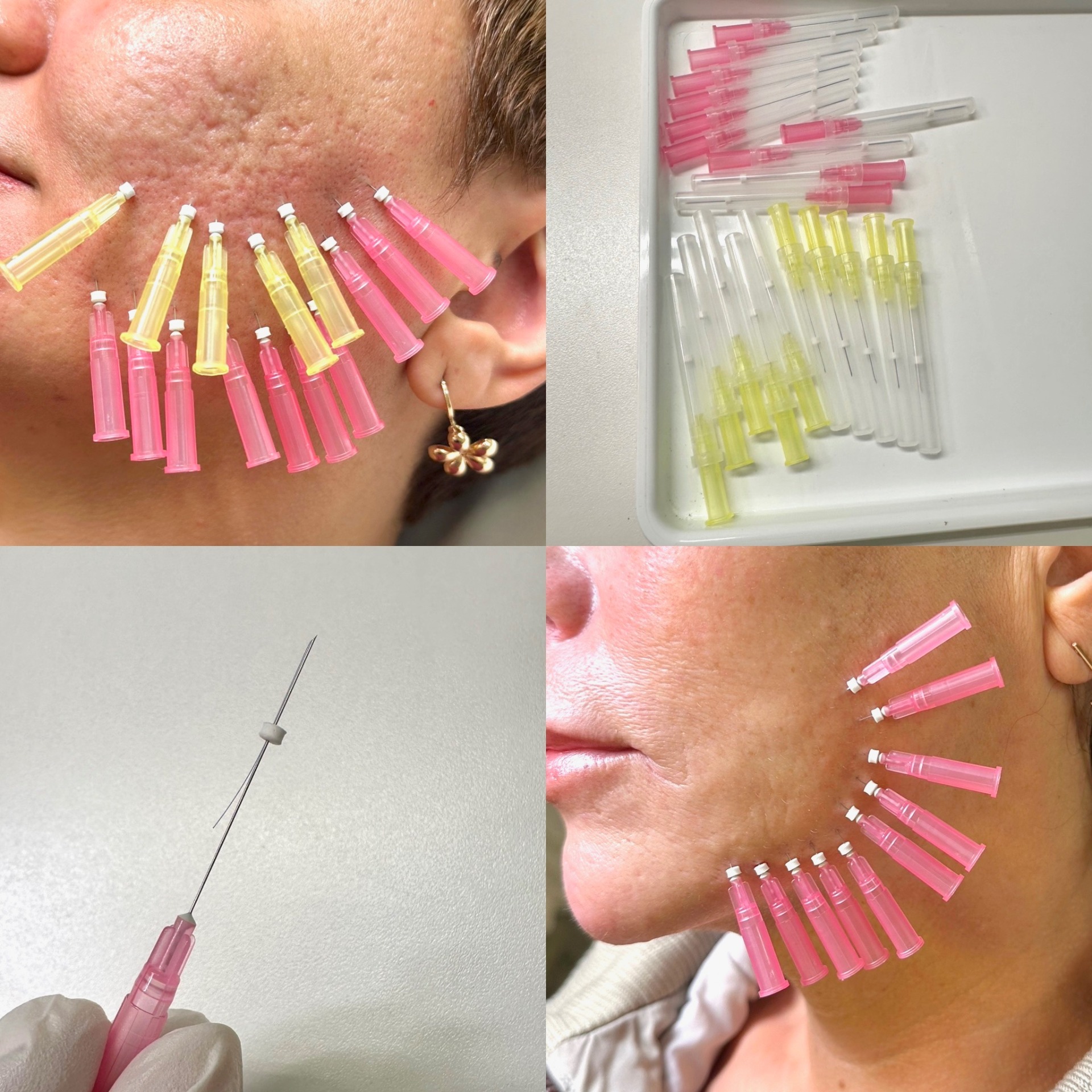 1. Insättning av trådar: Tunna, nedbrytbara trådar förs in under huden med hjälp av en nål eller kanyl. Trådarna är oftast gjorda av polydioxanon (PDO), som är ett material som används i kirurgiska suturer och bryts naturligt ner i kroppen över tid.